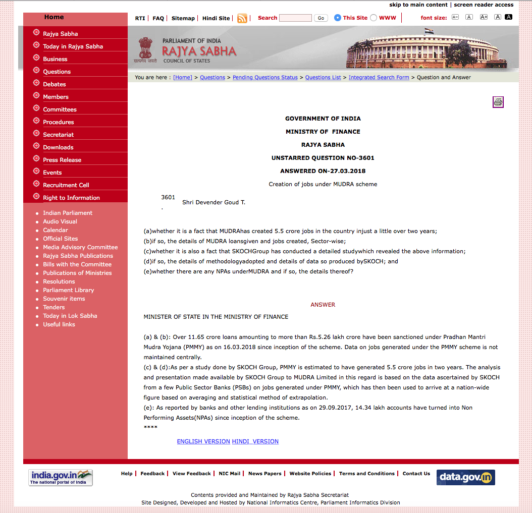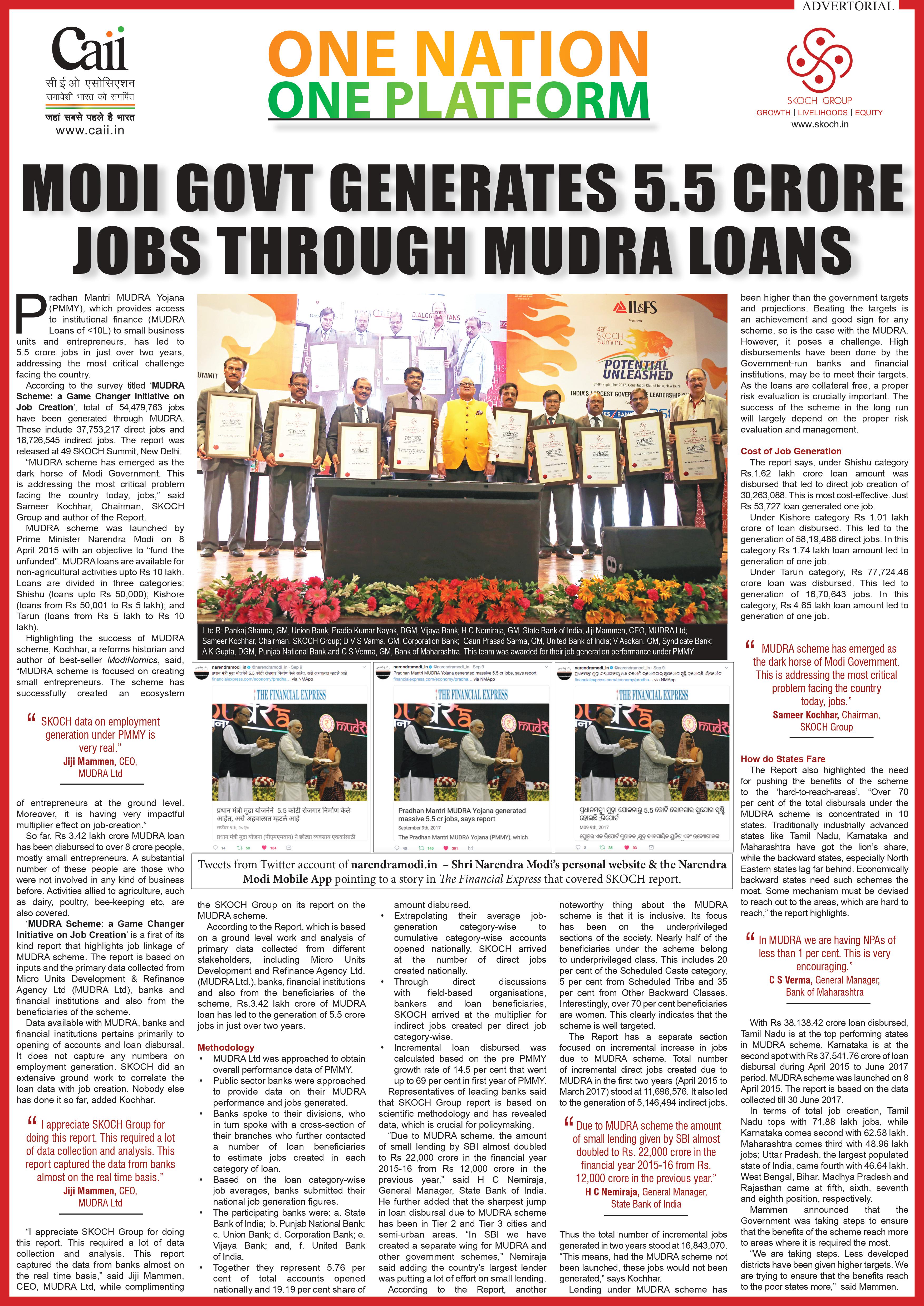 “MUDRA scheme has emerged as the dark horse of Modi Government. This is addressing the most critical problem facing the country today, jobs,” said Mr Sameer Kochhar, Chairman, SKOCH Group and Author of the Report.